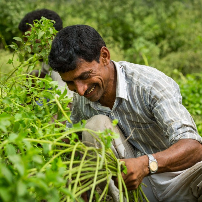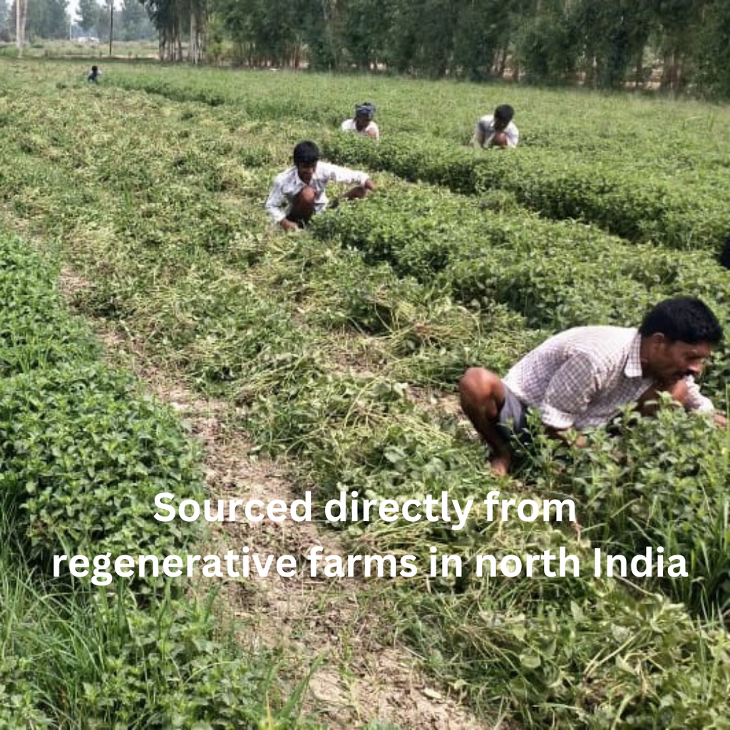 These premium leaves are grown by a network of farms in a rural corner of north India that practice regenerative agriculture. More than 'just organic', regenerative farming places strong emphasis on enriching the soil various ways (i.e. composting,  encouraging biodiversity, growing cover crops and conservation tillage for example) to ensure climate mitigation and future economic resilience for farming communities.
