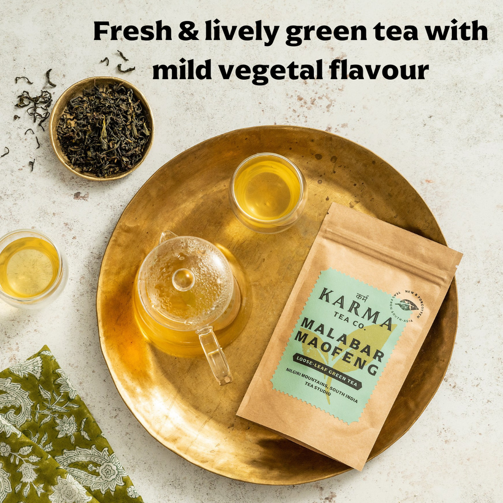 Malabar Mao Feng is my green tea of choice at Karma. It is a delightful tea and a pleasure to drink. I usually get three brews from my 2.5gm leaves, the second brew after the leaves have been wet once, tasting the best.